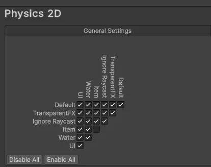 - Project Settings > Physics 2D > Item끼리 충돌 해제