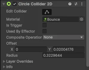 - PhysisMaterial 2D 머테리얼 생성후 Friction 0으로, Bounciness 1로