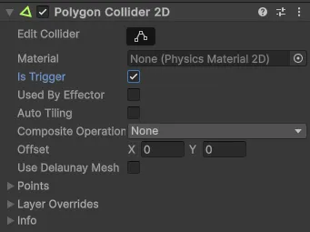 Polygon Collider 2D 추가 후 isTrigger 체크 (유니티6은 Box Collider도 가능!)