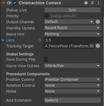 - Cinemarchine > Targeted Camera > 2D Camera 추가, Tracking Target을 플레이어로, Lens 3으로