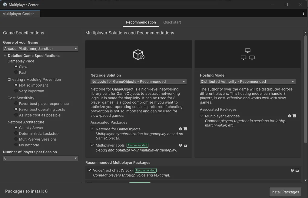 Edit - Project Settings - Services- Window - Multiplayer Center에서 Game Specifications 설정 후 Install