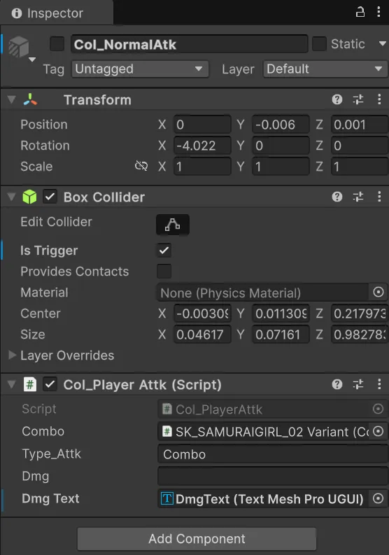 - 애니메이션 녹화버튼을 이용해 공격 콜라이더를 공격 모션에만 활성화 시킴